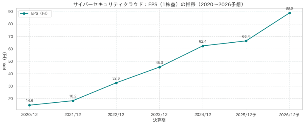 EPSは 14.6円 → 88.9円(2026/12予)と、予想込みで年率 35%ほどの伸びが想定されています。下記ラインチャートで見ると、途中に大きな凹みはなく、ほぼ右肩上がりのトレンドになっていますね。