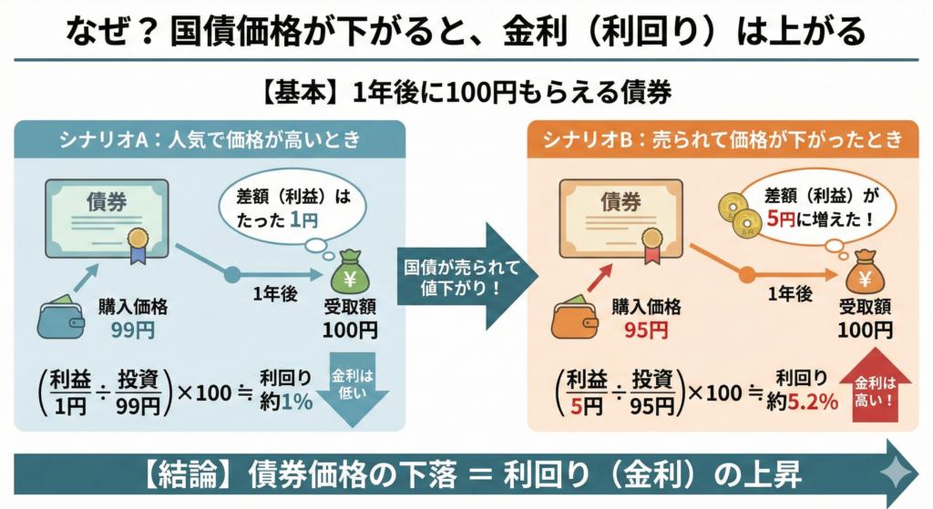 なぜ「国債が売られて価格が下がる」と「金利が上がる」のか、その理由は債券の仕組みにあります。