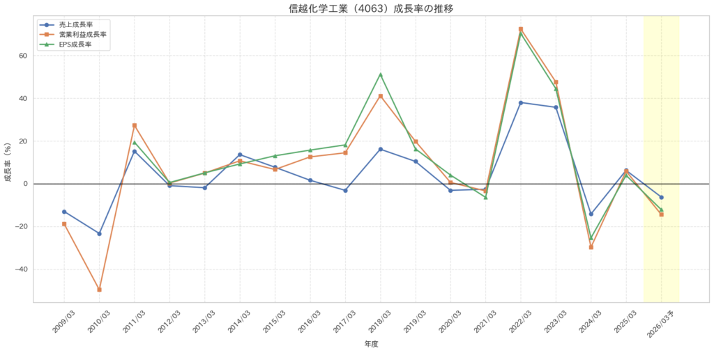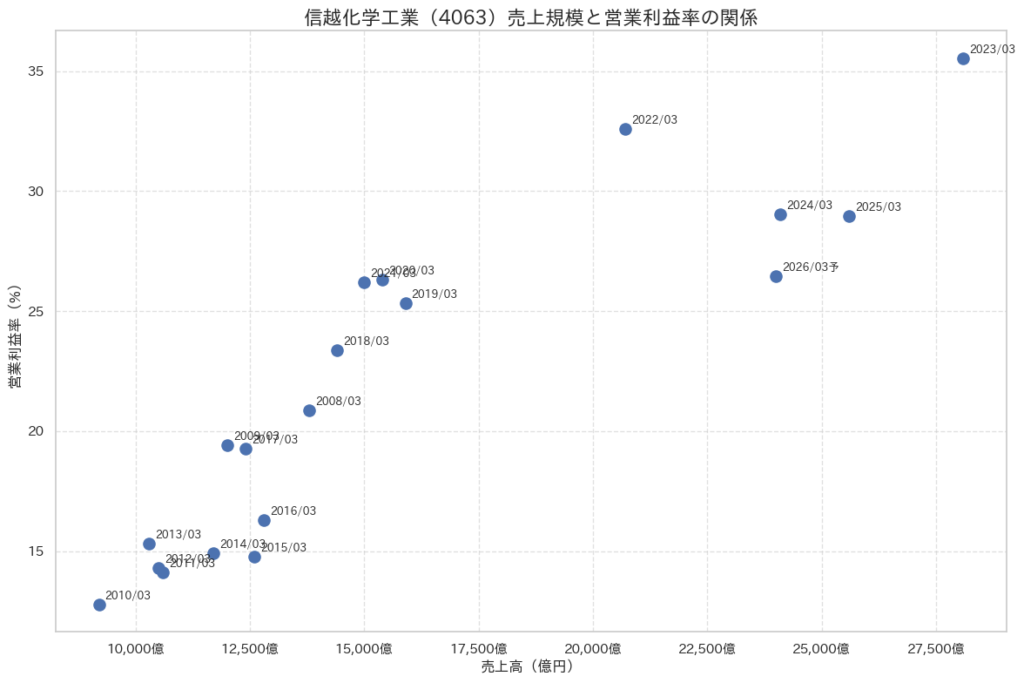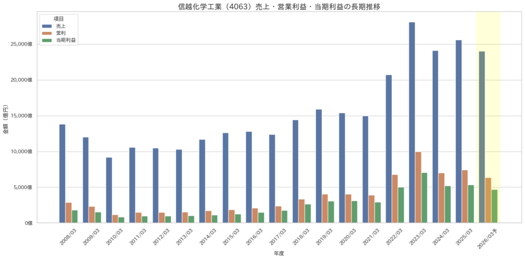 信越化学の長期業績を見ると、この会社は単に売上が増えてきた会社ではありません。売上以上に利益が大きく伸びてきた会社だとわかります。