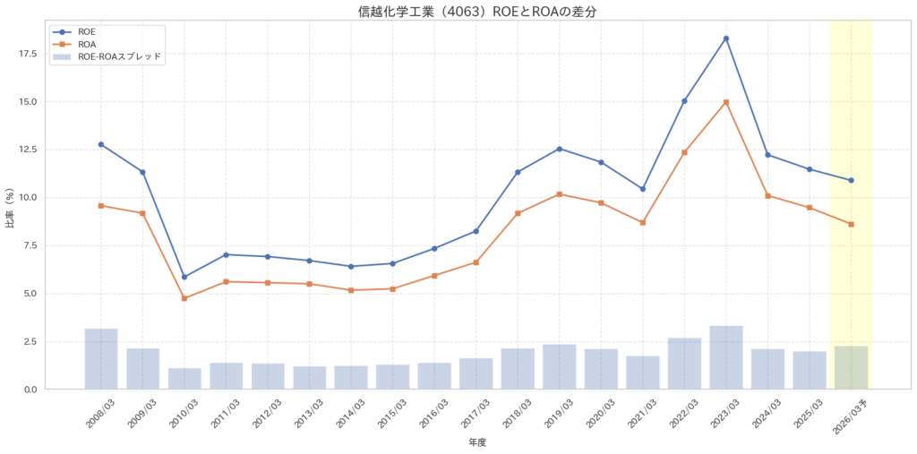 信越化学では、ROEはROAより高いですが、その差が極端ではありません。